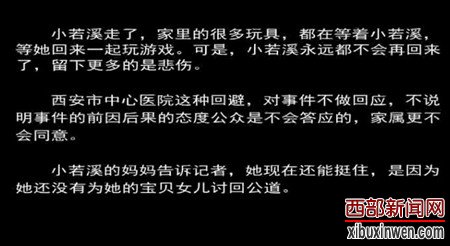严若溪妈妈:17号晚上,孩子就可冷可冷可冷,喊“妈妈、妈妈我冷”,我就给她盖很多被子,过了一会儿孩子就抽过去了。医生就来了,给孩子打安定,打了好多针我也不知道是什么,孩子就再没醒来,她们说孩子睡着了。可是我觉得孩子没有反应,我就一遍一遍的叫医生,医生说:“睡着了么,高热惊厥我们见多了,急啥呢,我知道还是你知道?”我给孩子一遍一遍的擦着降温,孩子就吐,从鼻子嘴里吐,我就叫医生、叫护士,她们都说没事。医生都叫不来,叫来了就把听诊器一搭,“好着呢”就走了。孩子吐了一夜,到半夜的时候,我发现孩子都拉到床上、尿到床上了,我又去叫护士、叫医生,护士也不给医生说,医生还在睡觉。孩子一点反应都没有,我叫她一点反应都没有,医生说是因为给了太大的镇定剂,她醒不过来,明天才能醒来。我就等,早上 六点,孩子已经从嘴里吐出紫色像血液的东西,但又不红。我又去叫医生,医生说“八点查房,第一个查你就行了,别喊了,我在想着你娃呢。”
