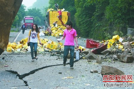 昨天下午,记者在现场看到,塌方路段边都拉起了警戒线。一块犹如房子般巨大的石头立在马路旁,两辆小轿车车身早已被压扁,面目全非,旁边一辆面包车也有不同程度的损伤。一辆装有啤酒的大货车停在路边,四分之一车尾被砸坏,陷于马路的坑中,啤酒瓶撒落一地,玻璃碎片铺了约50米。