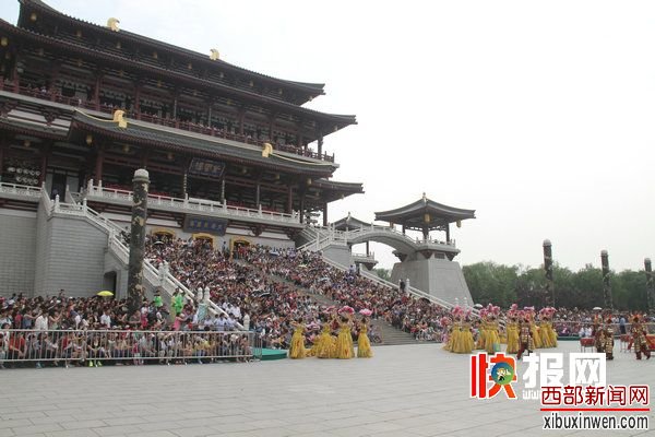 大唐芙蓉园紫云楼北广场的仿唐文艺表演吸引了众多游客