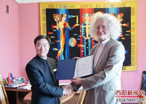 白俄罗斯文化联盟主席菠罗克·波佐夫向王钲朗颁发最高荣誉奖
