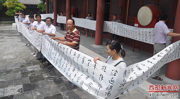 7月22日,徐州市青年书法家协会主席、岳飞第三十世嫡孙岳继承,将他历时一个月精心创作的70米“抗日诗词”书法长卷,捐赠给台儿庄古城,以此纪念中国抗日战争胜利70周年。台儿庄古城管委会王兆海副主任等领导代表古城接收了书法长卷,并向岳继承颁发收藏证书。