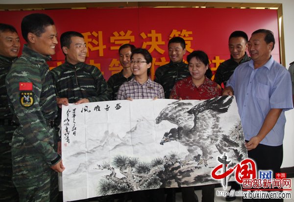 中国网消息:(记者 蔡广银)7月23日,全国爱国拥军模范曹迎军、倪正娥夫妇将一幅国画《鹰》赠送给武警武警猎鹰突击队官兵,鼓励官兵要像鹰一样勇猛。