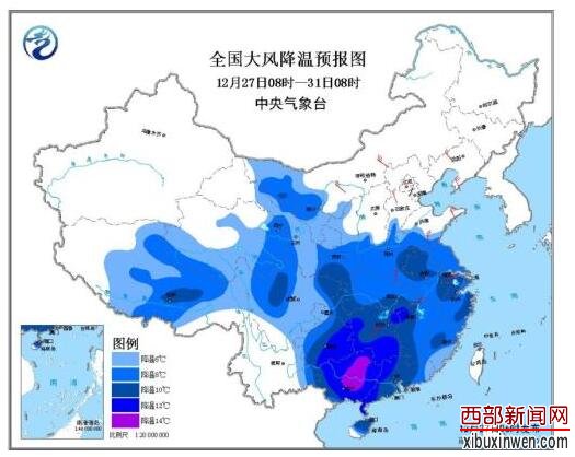 中新网12月27日电 据中央气象台网站消息,中央气象台12月27日06时继续发布寒潮蓝色预警,27日至31日,西北地区东部、黄淮南部等地区将先后降温6~10℃,其中贵州东部、湖南西部等地的部分地区降温12~14℃,局地超过14℃。