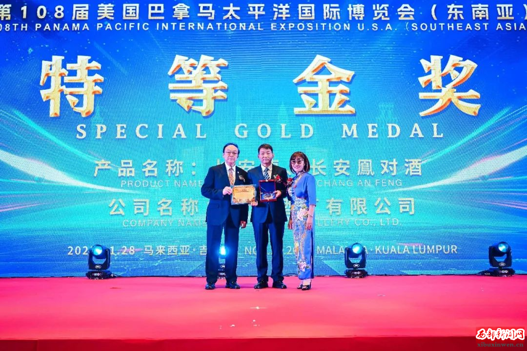 西部新闻迅(亚雷)2023年11月28日,2023年第108届美国巴拿马太平洋万国博览会颁奖盛典暨第十届世界华商论坛在马来西亚首都吉隆坡举行。来自中国陕西“家乡酒厂有限公司”的长安龍、长安鳯酒,凭借独特的酿造工艺和卓越的品质,荣获本届博览会“特等金奖”。领奖仪式上,美中经贸促进会主席乌巴特先生和美国巴拿马太平洋万国博览会组委会主席团主席、美国加州市长协会会长、核桃市首位华裔市长MARY SU女士为家乡酒厂颁发了本届博览会最高奖“