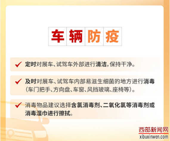 在安全防疫指南中,长城皮卡要求经销商定时对展车、试驾车外部喷洒消毒剂进行杀菌消毒;及时对车内部客户触碰过、易滋生细菌地方进行杀菌消毒。首先,采用含氯消毒剂或二氧化氯等消毒剂,对汽车外部重点部位如门把手、车窗、玻璃、后备箱开关等实施严格杀菌消毒,并在每次驾乘前后都对车钥匙认真消毒,减少病菌进入车内的几率。其次,上车前,重点擦拭座椅、安全带、方向盘、档把、一键启动、仪表盘、屏幕等常用部位。另外,由专业人员对空调滤芯消毒杀菌,必要时更新滤芯。从外到内对车辆消毒杀菌,全方位无死角为每一位用户排除安全隐患,确保用车安全。