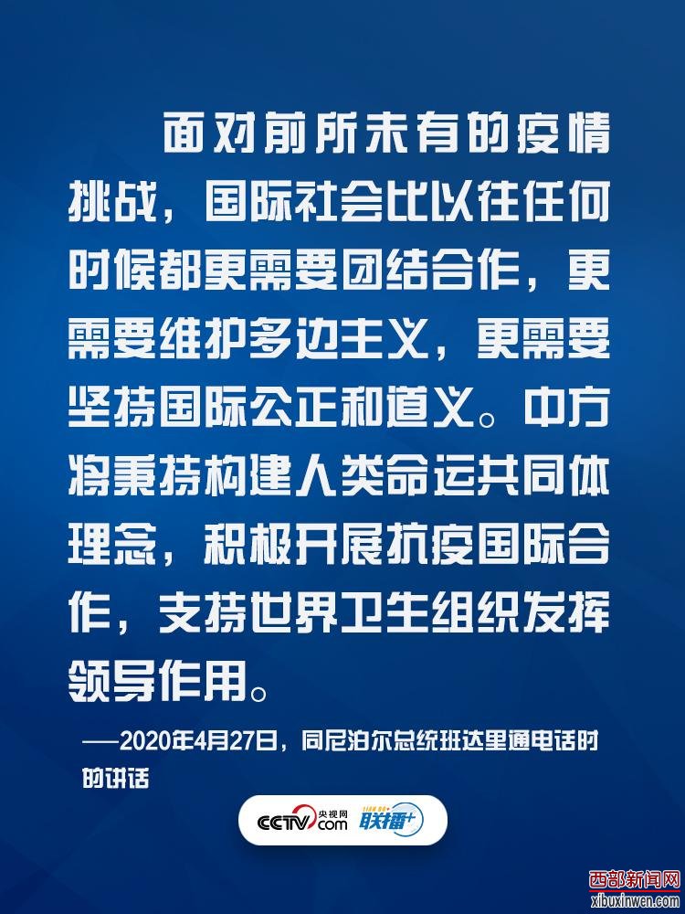 “新冠肺炎疫情的发生再次表明,人类是一个休戚与共的命运共同体”,“大疫当前,团结合作才是正道”。疫情发生以来,习近平主席通过电话、书信、视频等渠道开启“云外交”模式,“团结”是他讲话时提到的高频词之一。