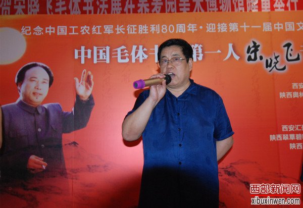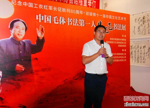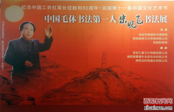 40年前的9月9日,中国人民的伟大领袖毛泽东主席不幸逝世。为了缅怀毛主席、纪念红军长征胜利80周年,陕西省政府名人书画院、西安荞麦园美术博物馆、西部新闻网和西安奥林文化传媒有限公司特主办了毛泽东特型演员、著名表演艺术家、中国毛体书法第一人宋晓飞毛体书法展纪念活动,活动的承办方为西安汇豪文化传媒有限公司、陕西翠草碧叶生态农业科技有限公司、西安及时雨酒业有限公司和陕西西部艺术团。