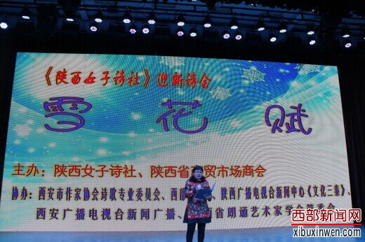 西部新闻网讯 (记者 张龙 摄影 刘国盛)昨天下午,陕西女子诗社与陕西省商贸市场商会联合举办的迎新"雪花赋"公益诗歌朗诵会,在西安市大明宫剧院盛大举行,为人们带来了一次心灵的休憇与洗礼。出席朗诵会的领导和嘉宾有:陕西省商贸市场商会会长戴林;陕西省国际文化交流基金会理事长曹东安;人民日报社陕西记者站原站长、陕西省新闻书画家协会主席孟西安;西部新闻网总编张龙;中国美协会员、陕西省新闻书画家协会特别顾问李少波;西安广播电视台新闻广播总监姜进科、西安市未央区作协主席张鹰等,著名播导、全国播音主持委员会副会长、全国"金话筒"银奖获得者海茵参会助兴,并与诗社的女诗人们同台朗诵,给予了女子诗社大力的支持。