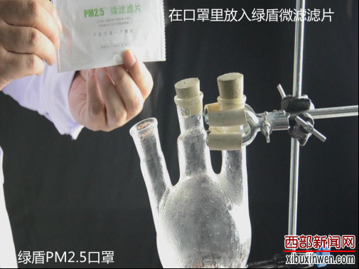 把带绿盾微滤滤片的绿盾PM2.5口罩固定在瓶口,通过看水蒸气能否透过口罩,来检测绿盾PM2.5口罩的透气性。