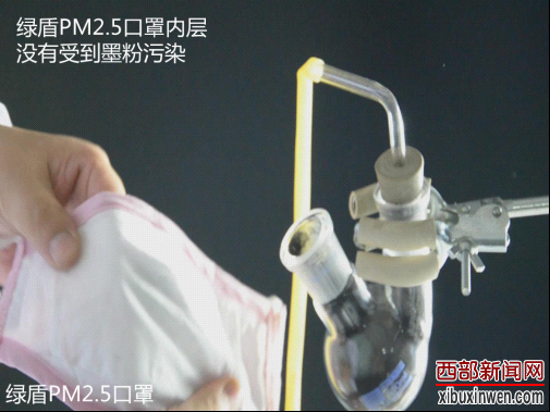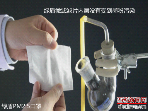 把绿盾PM2.5口罩(绿盾微滤滤片+康纶抗菌面料口罩)罩在装有墨粉的容器瓶口,为使效果明显,在上面蒙上一层餐巾纸。然后用给耐克充气用的打气筒对墨粉瓶进行100次充气,使墨粉在强大气压作用下通过瓶口不断冲击绿盾PM2.5口罩。