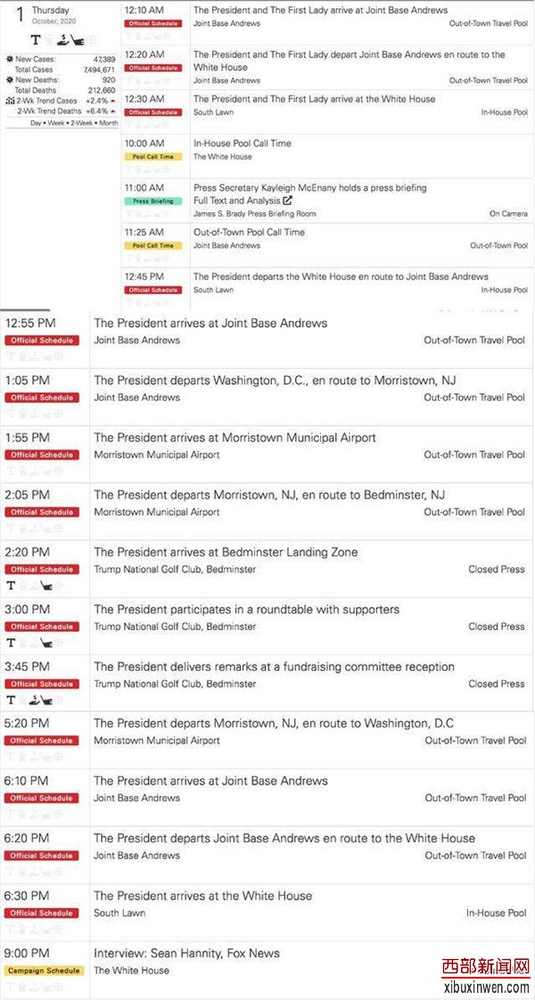 目前,希克斯确诊相关的感染路径追溯工作已经完成,但白宫并未透露更多细节。此外,《纽约时报》稍早前爆料,有白宫官员在周三(9月30日)就已经得知希克斯确诊,对此发言人并未证实。