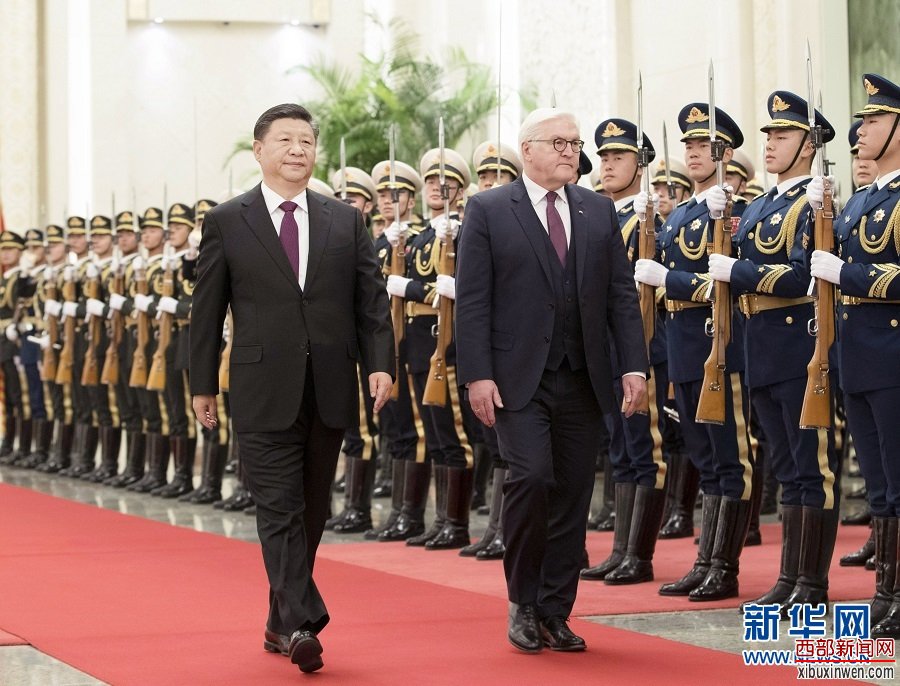 会谈前,习近平在人民大会堂北大厅为施泰因迈尔举行欢迎仪式。杨洁篪、丁仲礼、王毅、夏宝龙、何立峰等参加。