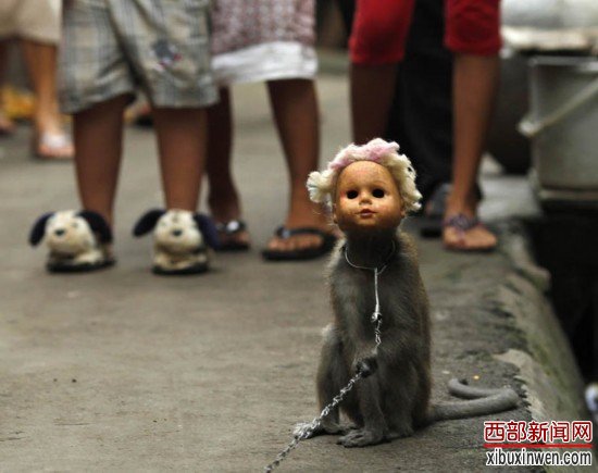 印尼雅加达,一只带着面具的猴子在街头表演猴面舞。训猴人Karmini称,他的四只猴子通过表演舞蹈,每天可以为他带来10美元的收入。