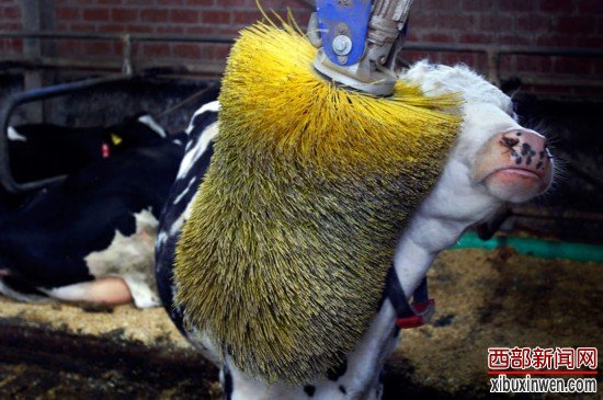 德国凯尔肯,一头奶牛正在享受机械毛刷的“按摩”服务。农场主介绍,奶牛们很喜欢这种“按摩”,它们甚至还排队,毛刷的梳理不仅让奶牛感到舒服,还能让牛奶优质高产。