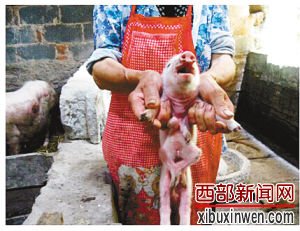 “这条小猪看起很正常,吃了几天奶,长大了不少。”老唐说,“肚子上前面两条腿很细,约三四厘米长,悬在腹下,后面两条腿要大些,约七八厘米长,拖在地上。脚里是骨头,但不能走动。”他不知道是否与身子骨相连,“没敢摸,怕摸坏了。”