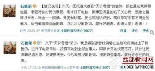 因报道“县委书记慰问贫困老党员,会场出现九五至尊香烟的新闻”引领导震怒,西安晚报记者石俊荣被要求停职。7月1日,石俊荣通过微博表示诚恳接受停职,今后会汲取教训。新闻出版总署新闻报刊司新闻业务处处长农涛回应称,“报道没有不当,地方滥用职权。”