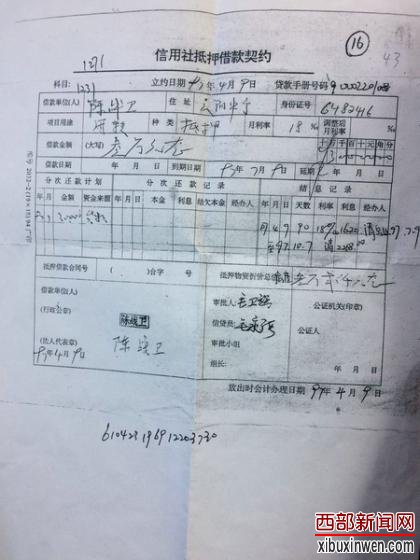 4月9日在泾阳县陈先生办公室。陈说:“ 1997年自己竟然“被”泾阳县泾干信用社无中生有贷了一笔贷款,几十年来也没人找我要过,为了弄清楚这笔贷款的详细情况,我找到了97年那笔贷款的信用社抵押借款契约,抵押借款契约上的签名和贷款人地址均不是我本人的,只是音同字不同,但身份证号码却是我本人的,而1997年时我还没有办理身份证,第一代身份证是2003年办理的。