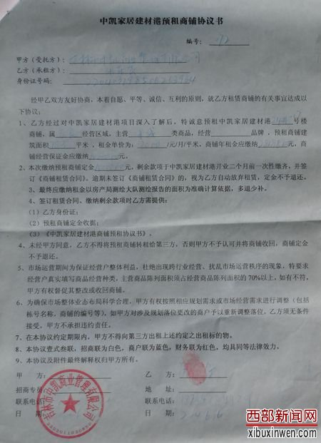 据张俊琴、张丙顺介绍:他们是2014年10月份来到这里的,当时是以招商引资的名义被招来的,中凯物业当时承诺可以先住着,等到开业了再交房费,于是双 方签订了《中凯家居建材港预租商铺协议书》,张家交了一万元保证金,就开始进入。之后,他们又花了10多万元,将房屋进行了装修,之后便开始试营业了。可 是,他们入住后才发现,这里的生意并不像当初被招来时候招商者说的那样好。到了今年6月20日左右,中凯物业要求他们这里的20多家小饭店签订新的合同, 一些商户告诉他们:中凯物业提供的新合同上有很多空格,说白了就是空白协议,还不让商户们看就让签字,于是他们和另外几家就始终没有签。由于他们不签合 同,中凯物业有个姓于的经理和一个叫做王春光的副经理就带着人将他们的自来水给关了,他们去找物业公司,但是中凯物业的态度很强硬,坚称:“不签合同就不 给恢复供水!”无奈,他们又去找供水公司,供水公司马上就来人恢复了供水,并告诉他们:物业没有任何权力给商户或者住户停水,中凯物业私自停水是违法的! 但是后来,中凯物业又来人把他们的水给停了,他们又去找供水公司给恢复了。还有一次,被物业停水后,他们到派出所报了案,派出所介入后,自来水马上被恢复 了,也就是从那以后,他家的供水才正常了。