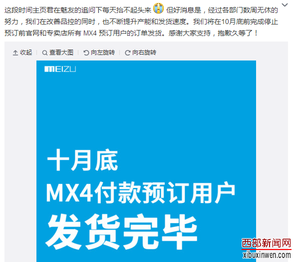 根据魅族在微博上发布的公告显示,“我们将在10月底前完成停止预订前官网和专卖店所有 MX4 预订用户的订单发货。”而下面微博配图中的文字内容则说“十月底MX4付款预订用户发货完毕”。
