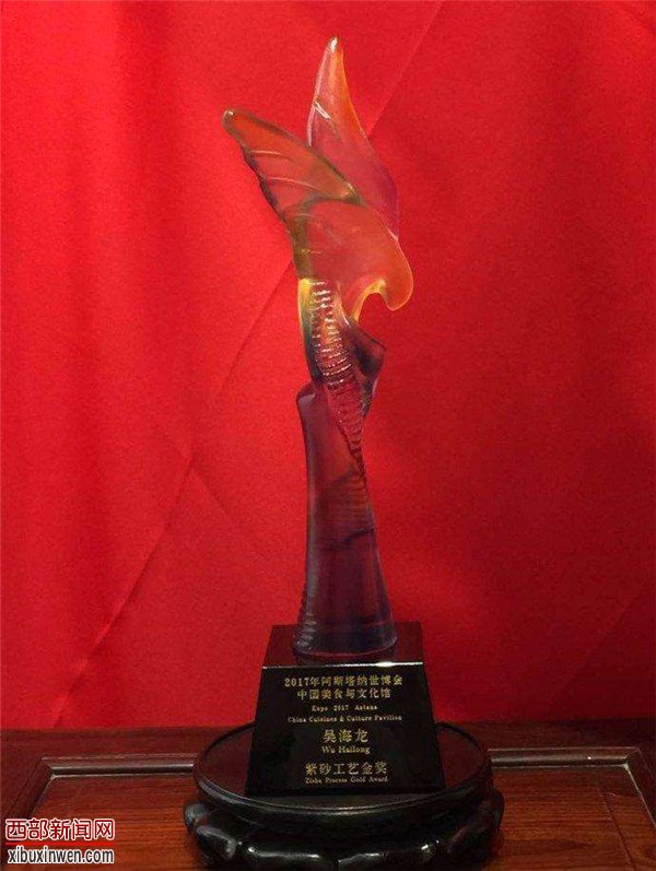 2017年,吴海龙大师凭借着精益求精的工匠精神和深耕紫砂多年的资深制作经验,其作品入选170多个国家总统总理出席的史上政治、艺术层面最高的顶级博览盛会哈萨克斯坦世博会并荣获紫砂工艺金奖、吴海龙大师也被评为2017年哈萨克斯坦世博会"特邀紫砂壶工艺艺术家"称号