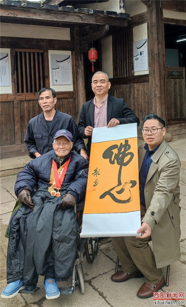李荣教授和西部新闻总编张龙饶有兴趣地联合采访了爷孙两代人不忘初心、为民造福的感人故事。采访结束时,为表达对梁敬定老人的敬意,李荣教授将自已的画作《江山如画》赠送给爷孙俩,祝愿祖国繁荣昌盛、人民幸福安康。青年书法家张龙先生赠送了书法作品《佛心》一幅,祈福梁敬定老英雄子孙满堂、幸福绵长。(文/李秋颖 摄影 马红)