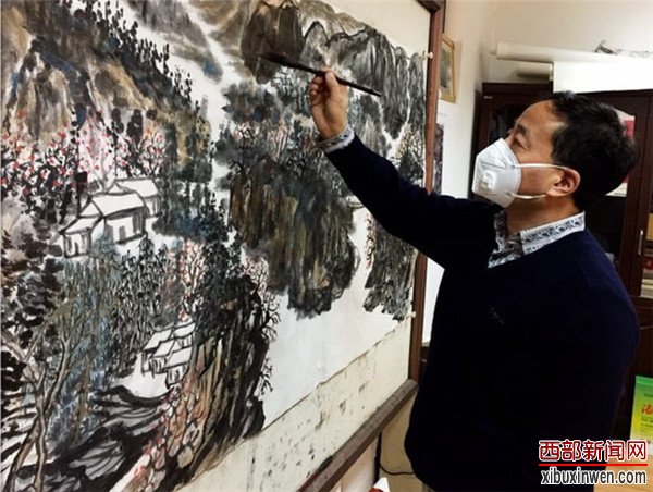 在这些文人习画的群落中,张立走了一条正面强攻因而艰苦备尝的路子。看起来,他想要当的真是那种正经八百的专业画家,执着在走一条将文人画的重意趣与专业画的重技趣两相结合的路子。他画华山、秦岭,画汉江田畴、巴山云雾,画陕北沟沟峁峁……竟敢画云霓那样的桃花杏林,整个横断于山腰,让粉色花带与绿色林带形成饶有情趣的纠缠。他画中的陕北高原不再是荒蛮的裸露,而是相伴着沟峁窑洞中的人们生存的温馨……他力图将古意盎然的山水和当下人们的生活有温度结合起来,显示了出新之意。敢用繁复到让你眼花缭乱的墨线来画华山画秦岭终南,真够胆大包天。但我们从中的确感觉到了画家擘画宏大画面和把握群山脉络的某种能力。他大度用墨却吝惜用色、敷彩,画面难得的洁净、透明,若山气清朗,若山月可人,“若言其明,杳杳冥冥;若言其昧,朗照澈明;若言其空,万用在中;若言其有,阆然无容。”这是中国画艺术中之最难以言传的美境的哲理依据。苏东坡赠妙善长写貌诗曰:“天容玉色谁敢画,老师古寺昼闭房;梦中神授心自得,觉来信手笔已忘。”张立几十年浸泡在文学、戏曲、音乐、书画、雕塑以及民间的各种文化中,并以记者的旁观眼界纵览着各种艺术的高人和顶级作品,有一种凌绝顶和一览众山小的问道,而且各种艺术交汇渗透,论其综合素养,是好多专职画家望尘莫及的。兴来振笔意超然,但见满纸生龙蛇,张立在创作中做了很多向度的尝试,在他的画中能读到赵望云的构图、石鲁的笔意、何海霞的晕染、方济众的造型,还有密体山水等种种蛛丝马迹。他以众家营养自家,在多种笔墨中确立自己的笔墨,在百家的师承中纷呈自家的百彩。从张立的画中,我们看得出他对大自然所蕴含的构图之美、色彩之美、线条水墨之美,已经有了自己的独特感受,有了将这种感受转化为有意味的审美形式的能力。当然还缺了一点熟练和老到,缺了一点儿意味和意趣。不过我想,只要有了对自然美与形式美的独特感受,加上勤奋踏实的研习,一切都是可以期待的吧。