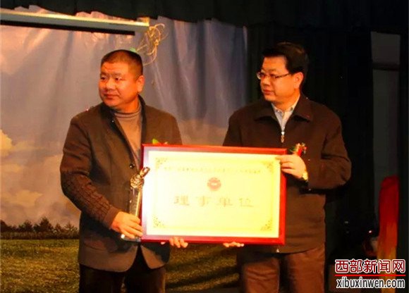 陕西省名人协会常务副秘书长、《名人大讲堂》总执行郑欣向西安新特龙通文化传媒拾黄金酒业颁发理事单位奖牌
