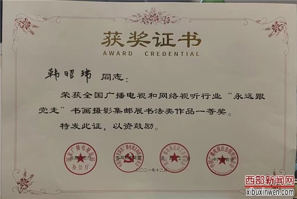 在刚刚结束的“全国广播电视和网络视听行业‘永远跟党走’书画摄影集邮展”中陕西广电书画艺术研究院韩昭玮同志荣获书法类一等奖,李荣同志荣获绘画类二等奖。