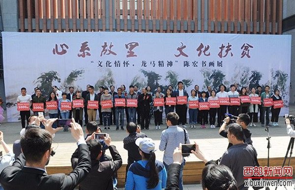 西部新闻网讯 (记者 张丽 摄影 刘华杏)4月28日上午,心系故里文化扶贫——陈宏书画作品展在渭南博物馆举行。开幕式现场,陈宏先生将自己作品义卖资金105000元捐赠给21位困难大学生。来自北京及家乡的200余位书画界代表参加了活动。