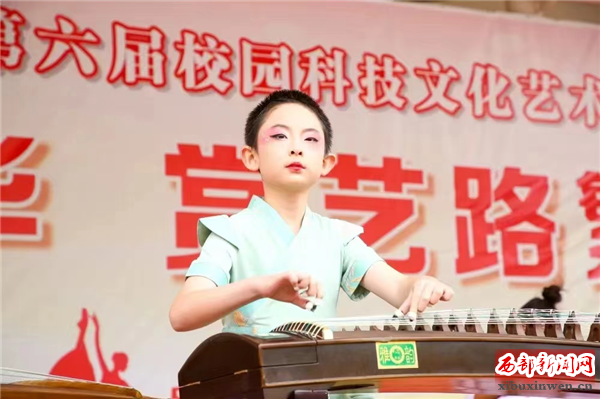 初夏的延安,群山叠翠,万壑葱茏。5月26日上午8时,延安职业技术学院附属小学科技文化艺术节器乐专场激情上演。演出中,由东翰古筝学员郭佳昊、郭嘉月等8人表演的古筝合奏《本草纲目+壮美延安》,以其娴熟自然的演奏、激越悠扬的旋律、唯美清妙的筝韵,为延职附小60华诞献上美好祝福,也赢得了现场观众掌声阵阵、赞誉连连。“6.. .. | .. 6.. | ……”随着郭佳昊悠扬的领奏,8名演奏者同时飞指拨弦,托抹挑提、按压揉劈,在大家娴熟的演奏中,《本草纲目》动感的旋律直抵人心,让现场观众听后自豪感瞬间充盈心胸。“中国人腰杆儿要硬、底气要足,老祖宗的东西值得我们一代代保护传承……”熟知《本草纲目》歌词的学生听着演奏发表感慨,“旋律中的节奏感与韧劲谁不爱呢!”中国民族音乐保存了民族的记忆和智慧,凝聚了中华民族自强不息的精神,是中华传统文化传承发展与交流的重要载体,是文化自觉、文化自信的重要根基。古筝是弹拨弦鸣乐器,又名汉筝、秦筝,流行于全国各地。因其音域宽广,音色优美动听,演奏技巧丰富,表现力强,被称为“众乐之王”,亦称“东方钢琴”,常用于独奏、重奏、器乐合奏和歌舞、戏曲、曲艺伴奏,是中国古老、独特、重要的民族乐器之一。少年强,则国强。《本草纲目》的铮铮激越才刚结束,《壮美延安》的悠扬婉转接踵而来。舞台上,郭佳昊、郭嘉月等8名演奏者身着华服,气韵悠然,端坐筝前,十指翻飞,拍扫勾刮、摇轮滑颤,通过悠扬曼妙的筝音,将红色延安的壮美河山呈现在了人们眼前,令场下观众沉醉不已。“听着这样优美的旋律,让人仿佛看到了九曲黄河海晏河清,厚重黄土层绿叠嶂,湛蓝的天空下,延安宝塔山正熠熠生辉……”学生家长刘海燕尤其喜欢东翰古筝学员演奏的《壮美延安》。郭佳昊、郭嘉月、杨雨晴、郝一菲、许一诺、李京洋、朱嘉怡、刘子歌8位演奏者分别为延职附小三至六年级学生,都在东翰古筝学习古筝演奏。