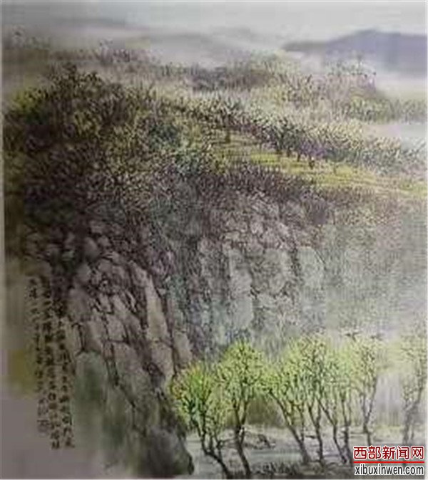 他是当代长安画派中的一员大将,也是一位代表性人物。这个位置是他用相当的艺术功力和强烈的个性面貌赢来的。他—反长安画派传统中以墨为主的技法,落墨极重,落彩极重,形成彩墨并茂的视觉效果。他以短促有力的墨线和紧劲密匝的彩线相渗相接的手法,如织锦瑟般地画出了硬朗、坚实的物象质地,也画出了浓郁热烈的生命活力。曾经以苦涩、荒凉、贫瘠为特点的西北山水意境在他的笔下换成了温醇、绚丽、辉煌的山水华章。厚实的黄土高原及生态环境落入他的视野,便生成了陕西水墨艺术充实、具体的西北风仪。