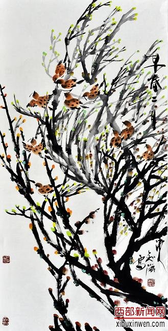 从他的花鸟画中,我们可以感受到大自然的蓬勃生机和新时代的昂扬诗情。他很少去描绘罕见的奇花异草、珍禽异兽,而是着眼于生活中常见的花果虫鸟,给人一种朴实亲近的乡土感情。他的画没有古代院体画那种恬淡幽远的隐逸气、江湖味,它是入世的、属于我们新的时代和人民的艺术。繁盛、充盈、丰实、欢乐、光彩照人、典雅秀丽、风流蕴藉、活泼天真、雍容豁达、泱泱大度,这就是杨知强写意花鸟画的基调和风格。读他的画,如同聆听一部华彩乐章,或者说是急管繁弦的江南丝竹,是对大自然的讴歌、对生活的赞颂、对美和爱的咏叹,唤起人们热爱生活、热爱劳动、热爱乡土、热爱人民的美好感情和高尚情操。因为花香鸟语、春华秋实,是大自然的赐予,更是世世代代劳动人民血汗浇灌的祖国沃土的绿色生命。画是无声诗,于无声处我们感受到时代的脉搏跳动,听到画家的心声,这是一颗人民艺术家炽热的赤子之心,他对祖国一草一木爱得那样执著和深沉,一笔一画都充满了感情。
