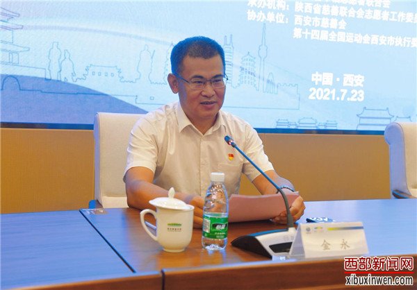 陕西省慈善联合合志愿者工作委员会副主任王洪代表全体志愿者发言承诺,陕慈联志愿委将一如既往不忘初心,用实际行动感召动员社会更多的爱心企业与广大志愿者“服务十四运,奉献我的城”,用志愿服务的方式助力十四运