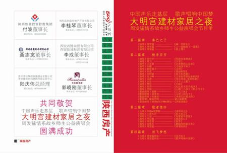 由陕西省文化厅、陕西省音乐家协会、中国传统文化促进会、中国国际声乐艺术研究会联合主办的“中国声乐走基层,歌声唱响中国梦——大明宫建材家居之夜•中国海政文工团陕西安康籍男高音歌唱家、声乐教育家周发猛先生情系故乡师生公益演唱会”,将于2014年9月7日晚,在西安交通大学思源学生活动中心盛大举行。届时将有3000多名社会各界人士获邀到场观看。
