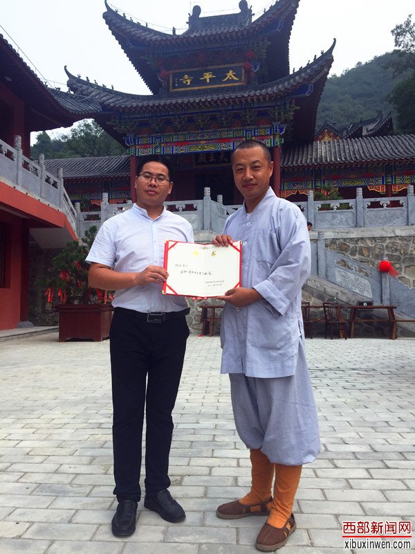 太平寺住持宏证法师为陕西名人书画院宣传部部长、西部新闻网总编辑张龙颁发太平寺顾问聘书