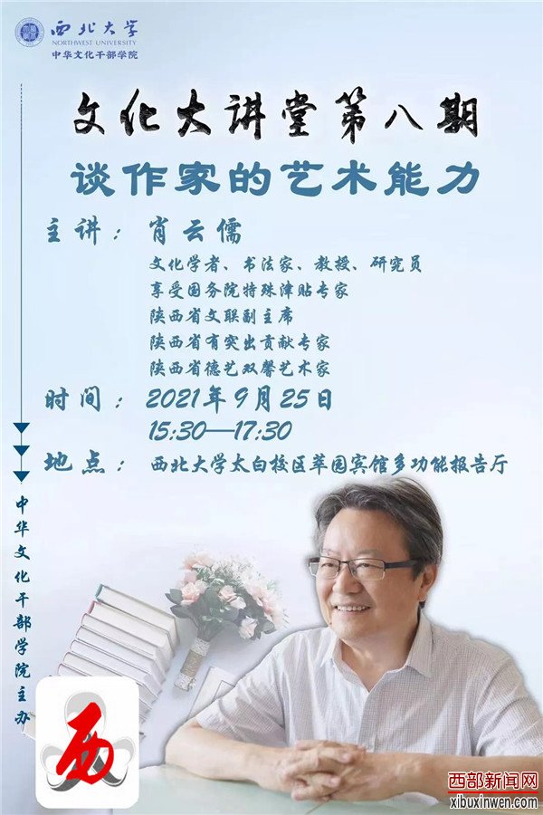 9月25日下午3点半至5点半,著名文化学者肖云儒老师在西北大学太白校区萃园宾馆多功能报告厅,在第八期中华文化大讲堂上,为陕西作协文学培训班及西北大学学生作了《谈作家的艺术能力》专题讲座,活动现场高朋满座,掌声雷动。