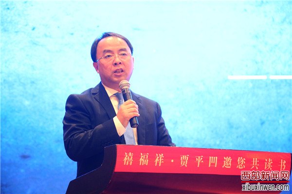 陕西禧福祥品牌运营有限公司总经理淮晓明在致辞中说:“很高兴能够参加‘禧福祥•贾平凹邀您共读书’全民阅读公益活动,我们禧福祥集团已经成立了16周年,在企业自身发展的同时,王延安董事长一直热心于文化、体育和公益事业。今年,我们很荣幸和贾平凹文化艺术研究院合作,冠名举办‘禧福祥•贾平凹邀您共读书’全民阅读公益活动,能够为全民读书,讲好中国故事,增强民族自信和民族自豪感尽一点绵薄之力,我们感到很荣幸。最后预祝活动越办越好,走出陕西,走向全国,让更多的人参与到全民阅读活动中来。”