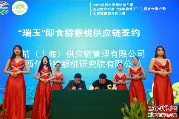 会上,周至县人大常委会主任何凡盟致辞并推介周至猕猴桃,与会领导为获得2021年西安市猕猴桃评优大赛金奖、银奖、优质奖获得者颁发了荣誉证书和奖杯。周至县特色产业中心与阿里巴巴集团-阿里云计算公司签订了产业发展助力乡村振兴战略合作协议,与中化现代农业有限公司签订了周至猕猴桃产业高质量发展技术服务合作协议;陕西佰瑞猕猴桃研究院与地精(上海)供应链公司负责人签订了“瑞玉”即食猕猴桃供应链销售协议。西安市农业农村局和周至县领导分别为陕西佰瑞猕猴桃研究院授“西安市农业种质资源保护单位”“周至县农村实用人才培训基地”牌。“陕西佰瑞猕猴桃研究院有限公司、周至县姚力果业专业合作社、陕西杨氏现代农业有限公司、西安异美园现代农业有限公司、西安市兴鸿果业有限公司”5家企业获得“周至县即食猕猴桃实践创新奖”。市农业农村局二级巡视员周新民、省农业农村厅一级巡视员高武斌先后做了重要讲话。会后,与会人员现场参观品鉴了获奖果品及周至即食猕猴桃,相关人员参与了直播代言活动。