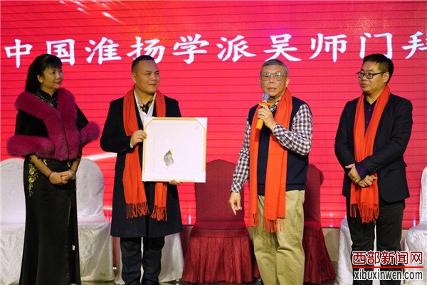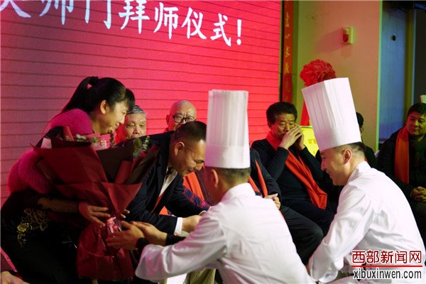 在随后举办的“中国淮扬学派吴师门拜师仪式”上,10位来自陕西淮扬菜行业的青年代表,则向中国淮扬学派吴师门吴利飞先生行拜师礼,敬拜师茶,接拜师礼。