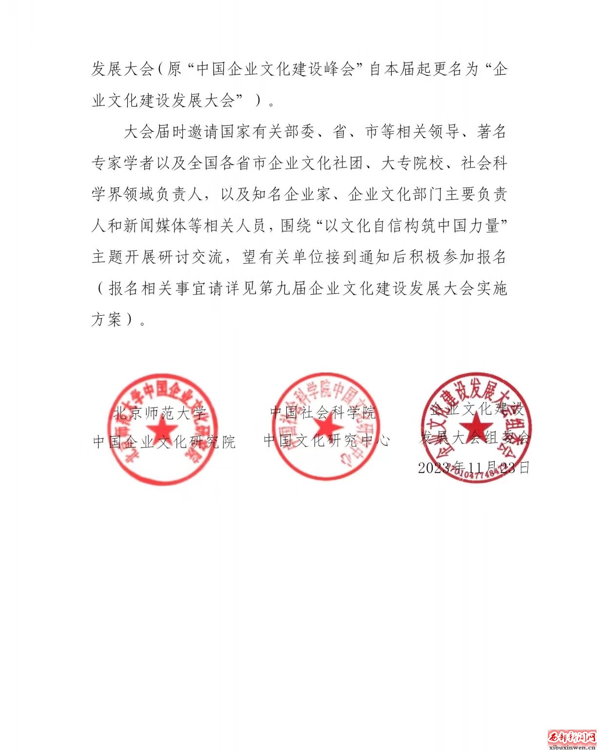 党的二十大报告擘画了全面建设社会主义现代化国家、以中国式现代化全面推进中华民族伟大复兴的宏伟蓝图,吹响了奋进新征程的时代号角。在全面建设社会主义现代化国家进程中,企业是重要力量,企业文化是凝聚人心、汇聚力量的重要基础,加强企业文化建设势在必行。为深入学习贯彻习近平文化思想,增强文化自信,构建企业文化特色发展新模式,激发新时代下的企业文化创新活力,推动企业高质量发展,北京师范大学中国企业文化研究院、中国社会科学院中国文化研究中心、企业文化建设发展大会组委会定于2023年12月22日-23日在广西桂林举办第九届企业文化建设发展大会(原“中国企业文化建设峰会”自本届起更名为“企业文化建设发展大会”)。