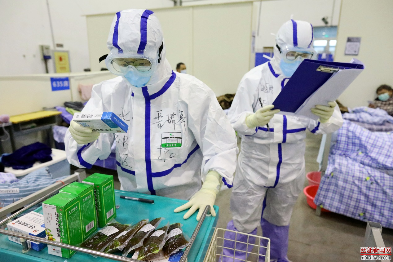 方舱医院医务人员正准备为新冠肺炎患者派发连花清瘟胶囊。