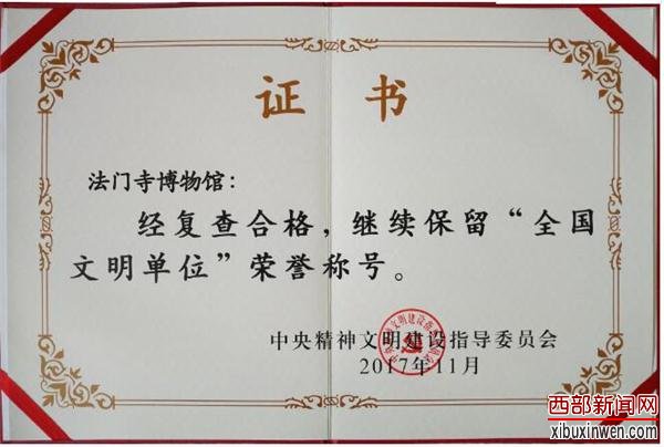 西部新闻网讯(曹光新)近日,陕西省文明办公布了中央文明委〔2017〕010号《关于复查确认继续保留荣誉称号的全国文明城市、文明村镇、文明单位的通报》,法门寺博物馆凭借精神文明建设的优异业绩和综合实力,再次荣膺全国文明单位称号。