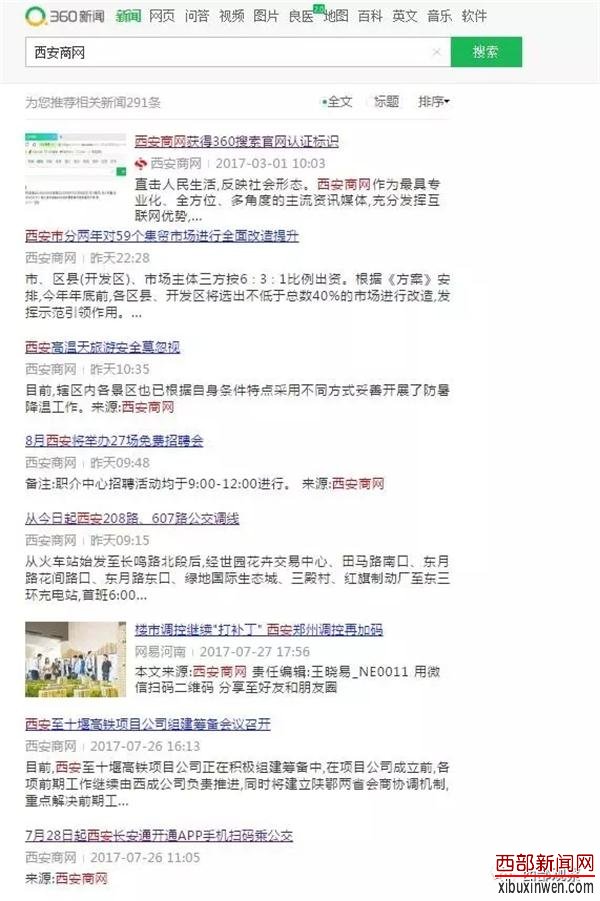 西部新闻网讯(张玲玲 实习生 申琴芳 雷凯虹)近日,西安商网顺利成为国内第二大搜索引擎360搜索的新闻源网站,这标志着西安商网在提供本土新闻资讯方面得到了360搜索的充分肯定和高度认可,也使网站影响力、品牌力、传播力的提升迈出了极其重要的一步。