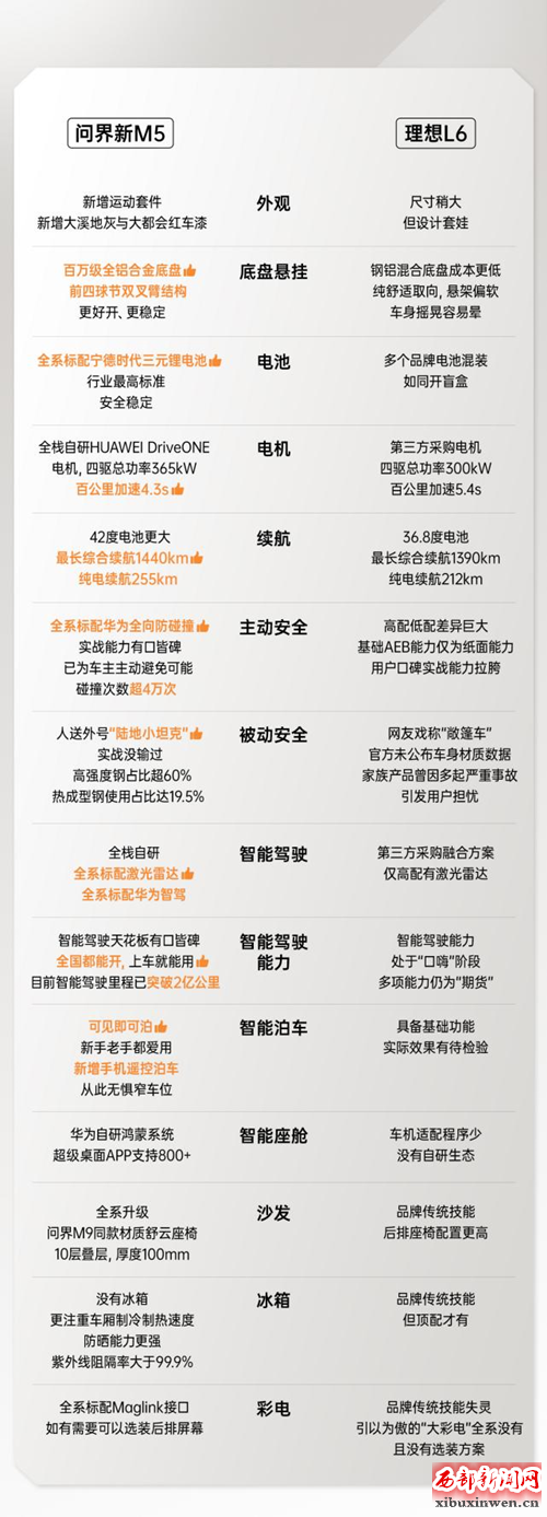 值得关注的是,最近刚刚上市不久的理想L6,采用了钢铝混合底盘,前双叉臂、后五连杆独立悬架。相较而言,问界新M5的底盘用料更扎实,稳定性更强,驾驶体验更佳。可以说,问界新M5的底盘素质不仅远超同级车型,甚至可与百万级豪车相媲美。总体来看,问界新M5在外观、续航能力、底盘配置上都强于理想L6,同时在主被动安全、智能驾驶、智能座舱等方面也有着比理想L6更加出色的表现。