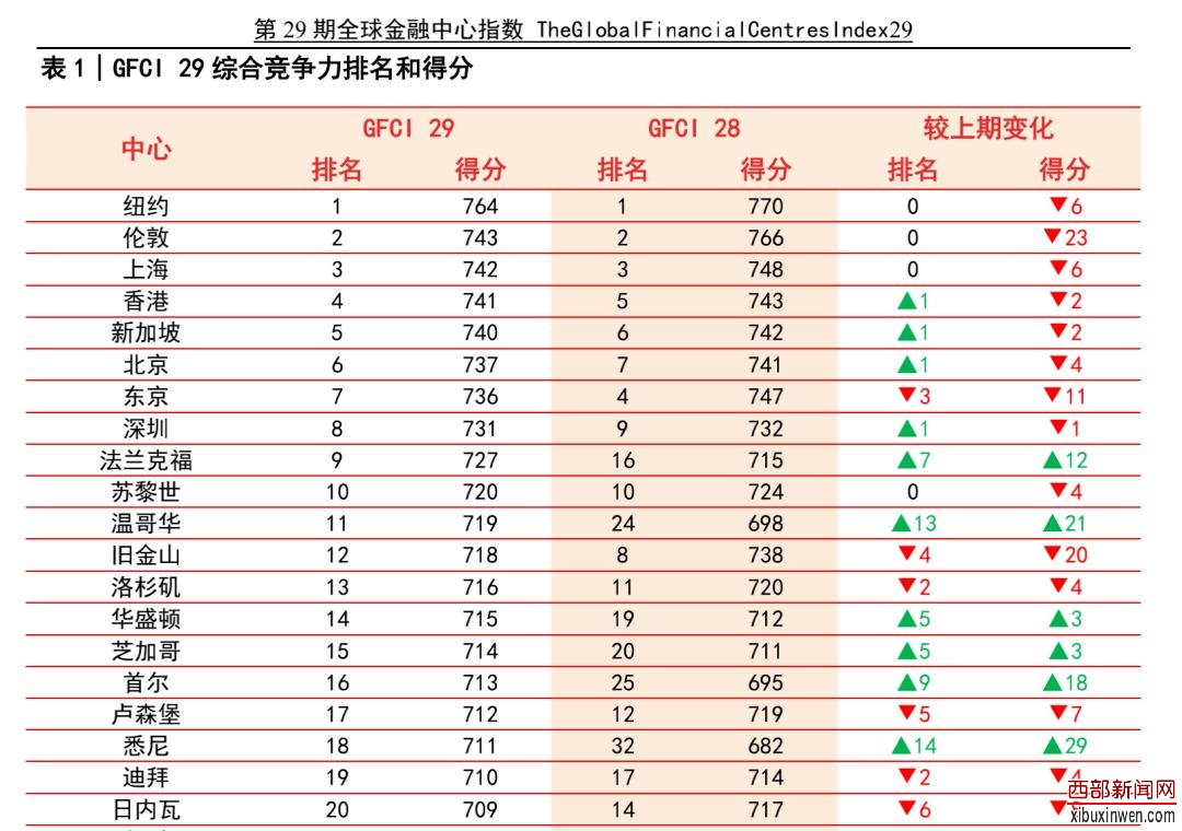 本期全球前十大金融中心排名依次为:纽约、伦敦、上海、香港、新加坡、北京、东京、深圳、法兰克福、苏黎世。