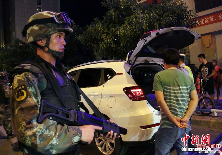 武警特战队员在西昌主要交通路口设卡。