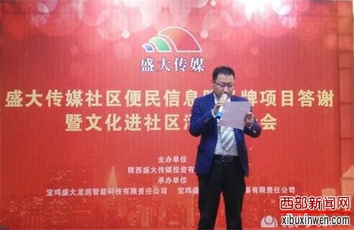 西部新闻网讯(记者 董宁宁)4月1日中午,“盛大传媒社区便民信息服务牌项目答谢暨文化进社区活动推介会”正式举行。陕西盛大传媒投资有限公司邀请宝鸡35家重点社区负责人以及阳光报等多家媒体,共同探讨科技和互联网对社区人文发展带来的促进作用。