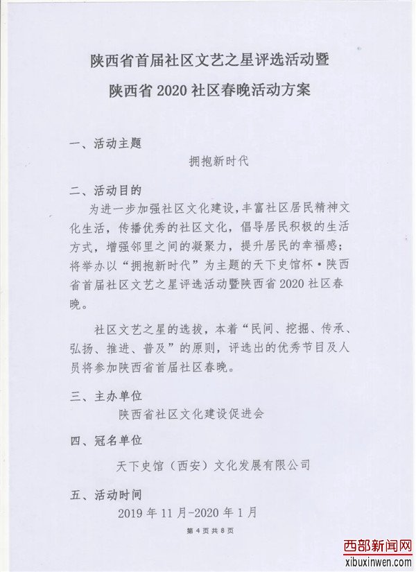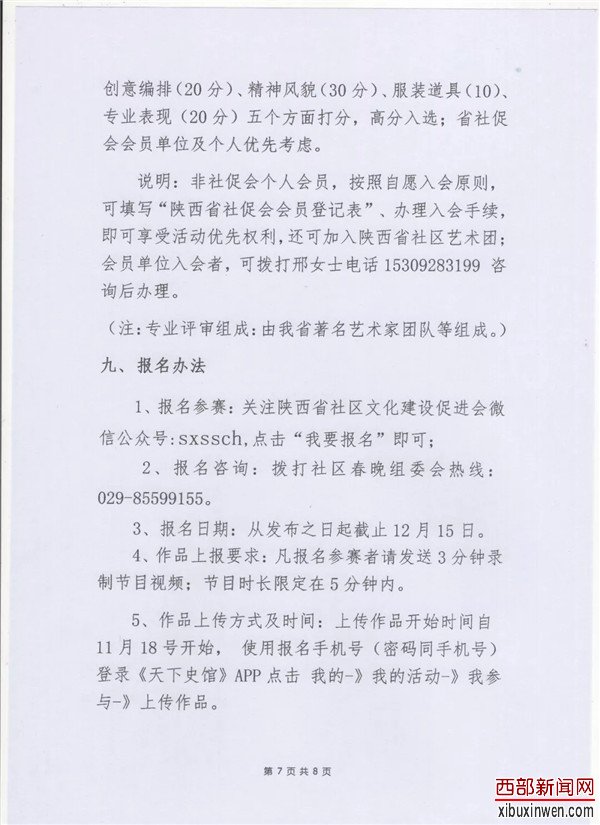 评选内容1、舞蹈类:少儿组、青年组、中老年组民族、民间舞、古典舞、芭蕾舞、当代舞、现代舞、国标舞、体育舞蹈等。2、声乐类:独唱、重唱、小合唱、大合唱美声、通俗、民族等各种风格的演唱;独唱、弹唱、载歌载舞、组合表演等形式。3、器乐类:独奏、重奏、合奏等民乐、西洋乐、打击乐等。4、非物质文化类:民间社火、秧歌等。5、语言类:相声、小品、朗诵、其他曲艺形式(脱口秀、相声、口技、声音模仿秀等);幽默剧、杂技、魔术、杂耍等搞笑表演。6、戏剧类:秦腔、豫剧、京剧、川剧、越剧等地方戏曲形式。7、模特类:少儿组、青年组、中老年组8、民间、个人绝活、绝技类武术、体育、绝技、各种器物打击乐等。聘请专业评审从报名节目中选拔25-30个节目参加2020年社区春晚节目的电视录制工作,根据报名节目视频的情况,评委将对个别节目进行现场评审。以上组别我们将分别评选出一等奖、二等奖、三等奖和优秀奖若干;授予“天下史馆杯•陕西省社区文艺之星”荣誉证书,并邀请参与2020陕西省社区春晚节目录制。活动安排:活动分为两个阶段:第一阶段:报名阶段(2019年11月15日至2019年12月15日):参赛者通过关注陕西省社区文化建设促进会微信公众帐号填写报名表,通过天下史馆APP上传作品;专家通过视频资料对节目进行初审;第二阶段:评选阶段(2019年12月15日至30日):根据节目内容及形式由专业评委实行打分:参赛节目的最终去留由专家评审团根据主题立意(20分)、创意编排(20分)、精神风貌(30分)、服装道具(10)、专业表现(20分)五个方面打分,高分入选;省社促会会员单位及个人优先考虑。说明:非社促会个人会员,按照自愿入会原则,可填写“陕西省社促会会员登记表”、办理入会手续,即可享受活动优先权利,还可加入陕西省社区艺术团;会员单位入会者,可拨打邢女士电话15309283199咨询后办理。(注:专业评审组成:由我省著名艺术家团队等组成。)报名办法1、报名参赛:关注陕西省社区文化建设促进会微信公众号:sxssch,点击“我要报名”即可;2、报名咨询:拨打社区春晚组委会热线:029-85599155。3、报名日期:从发布之日起截止12月15日。4、作品上报要求:凡报名参赛者请发送3分钟录制节目视频;节目时长限定在5分钟内。5、作品上传方式及时间:上传作品开始时间自11月18号开始,使用报名手机号(密码同手机号)登录《天下史馆》APP点击我的-》我的活动-》我参与-》上传作品。6、拟加入陕西省社区文化建设促进会入会方式:关注天下史馆(口述天下)微信公众号、点击“我要入会”即可。