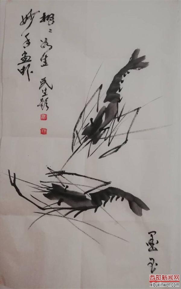 靖边县美协副主席野鹤老师观墨玉画虾题诗