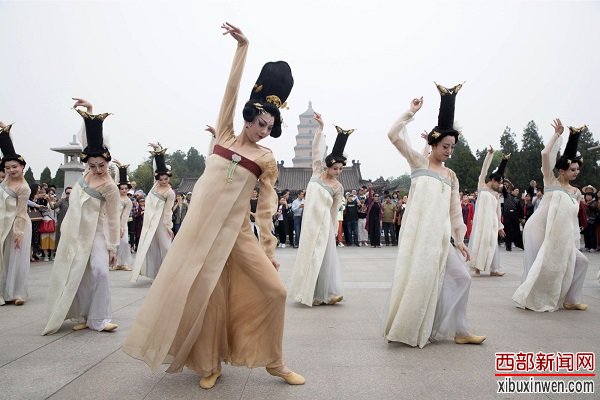 本网讯(李文化 报道) 燕舞高歌,丽人佳影,殿堂之上,丝竹齐鸣,盛世大唐一片安宁……4月23日上午,西安大雁塔南广场突然热闹起来!人来人往的广场中央,13名身着盛唐服饰的女子,现场演绎古典群舞《丽人行》,再现千年风采,吸引市民和游客驻足。